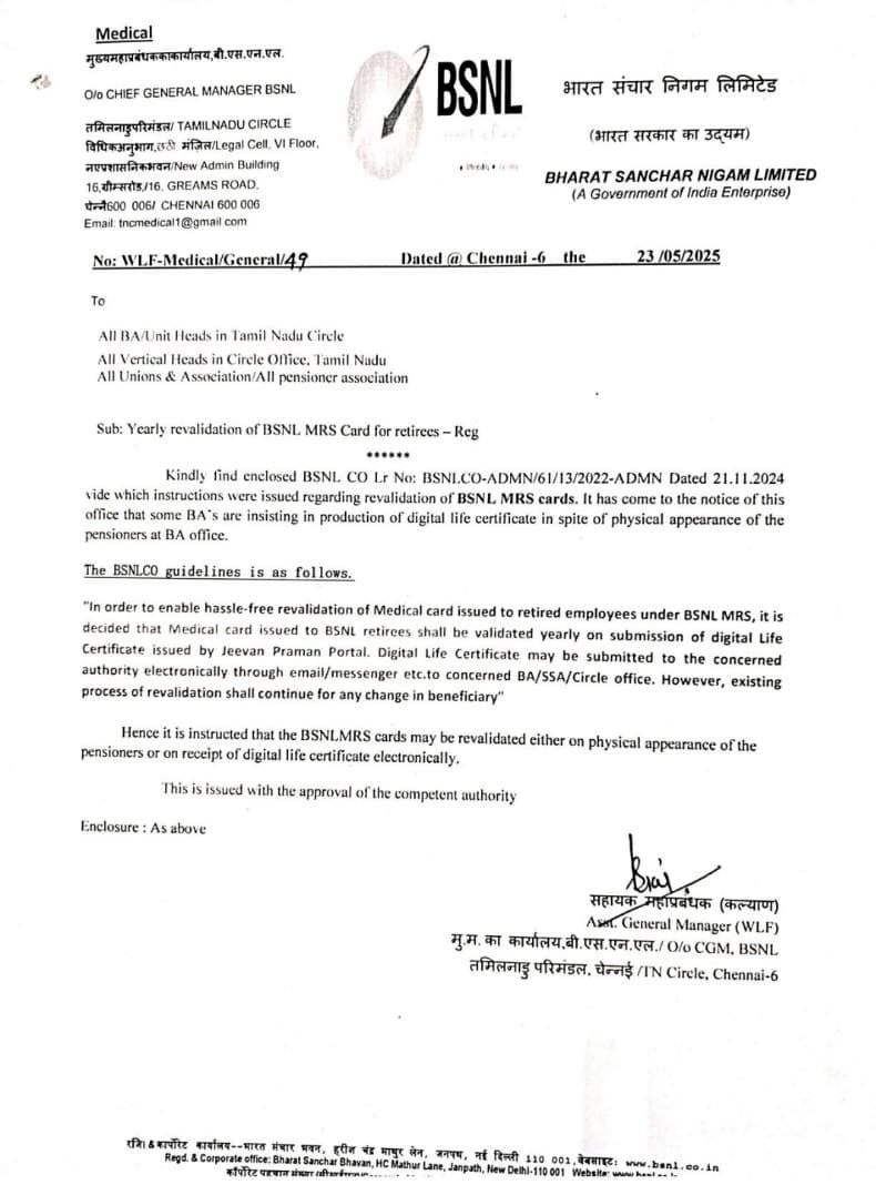 BSNL Cor Off instructions on Yearly revalidation of BSNL MRS card for Retirees 21-11-24