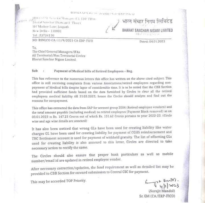 Payment of Medical bills of retired Employees reg - BSNL Cor Off instructions 04-01-2023