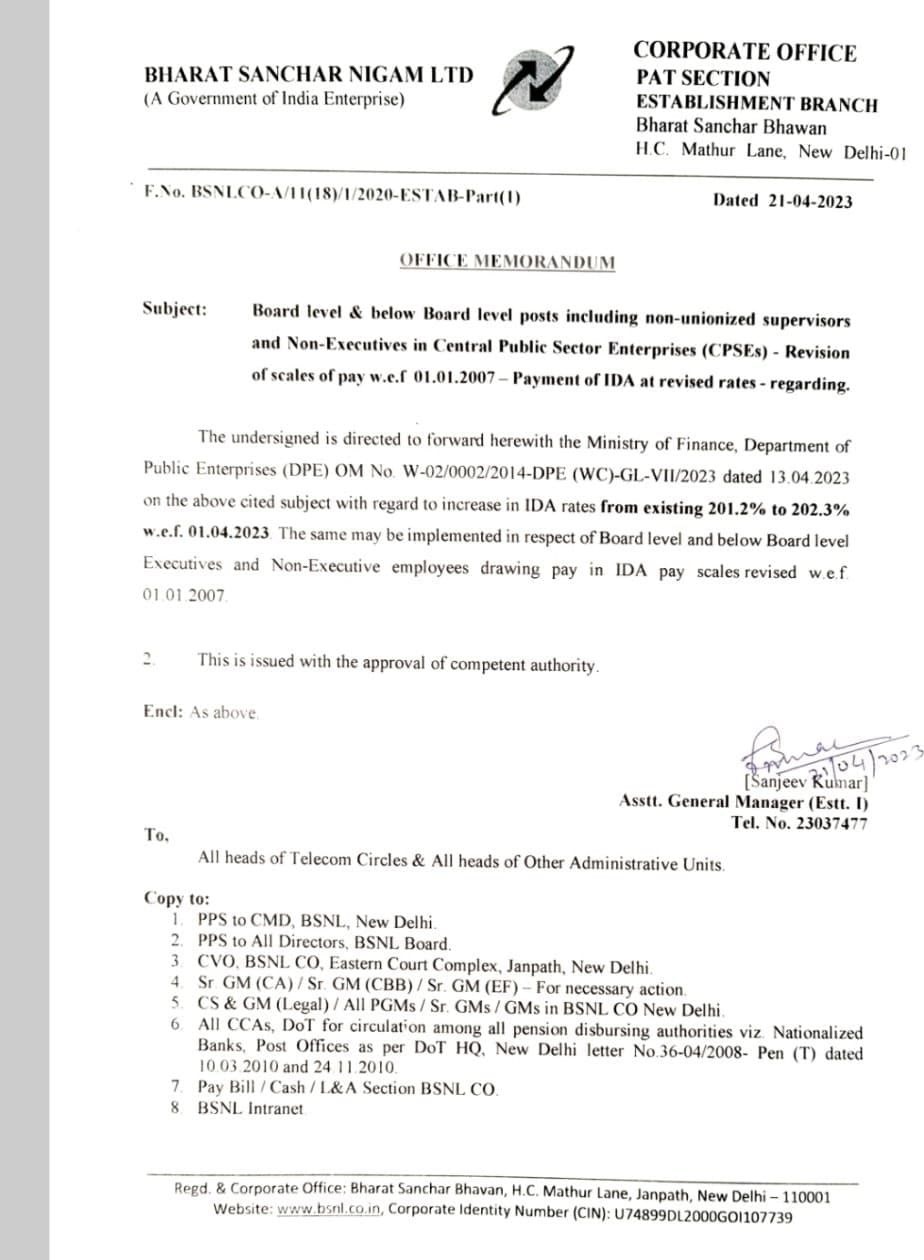 Revised IDA rate from Apr 2023 - OM dated 21-04-23 of BSNL Cor Off