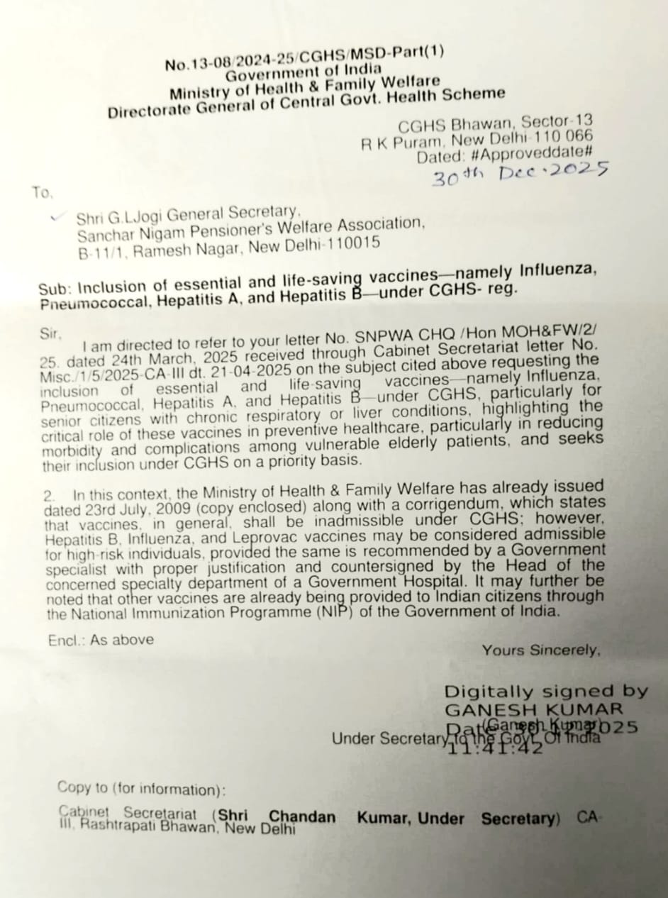 CGHS Office reply to GS SNPWA on the Inclusion of Life saving and essential Vaccines under CGHS 30-12-2025