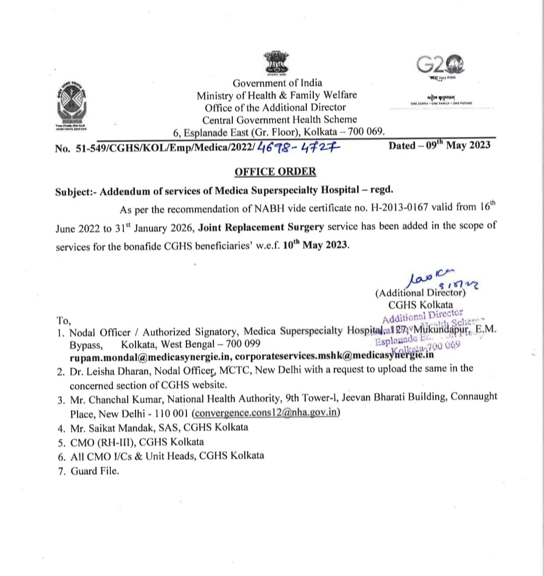 Joint Replacement surgery added as additional Services for bonafide n CGHS Beneficiaries -AD Kolkatta 09-05-23