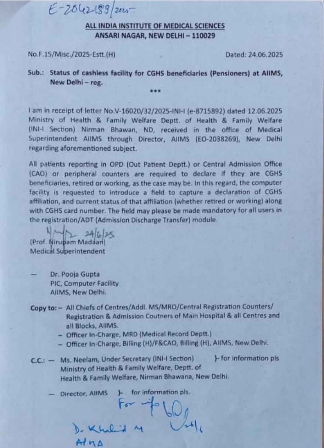 Status of Cashless facility for CGHS beneficiaries (Pensioners) at AIIMS New Delhi 24-06-25