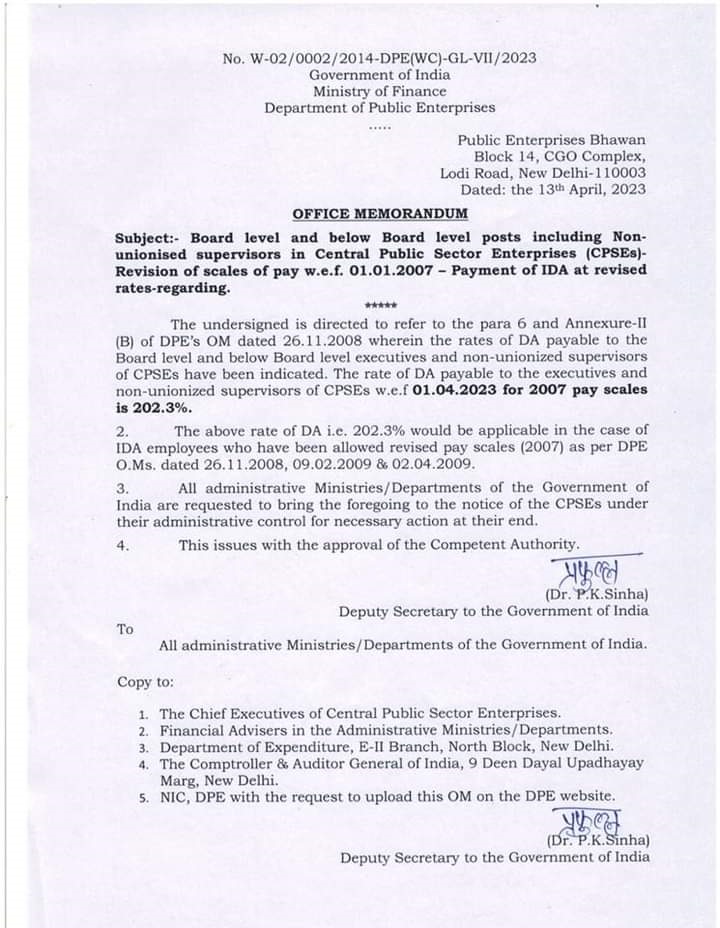 DPE OM on Payment of IDA with effect from 01-01-2025 for CPSEs following 2007 pay scales 28-01-2025